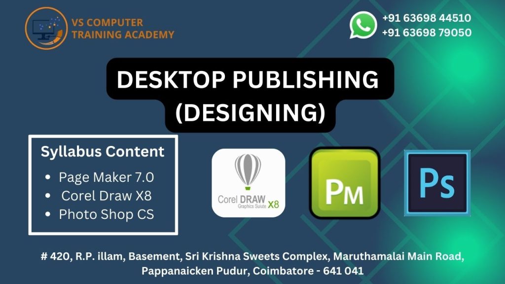 Mastering Desktop Publishing Designing opens doors to opportunities in advertising agencies, printing industries, digital media companies, and freelance design services. Start your creative career with VS Computer Training Academy and gain the skills needed to design professional and impactful visual content.