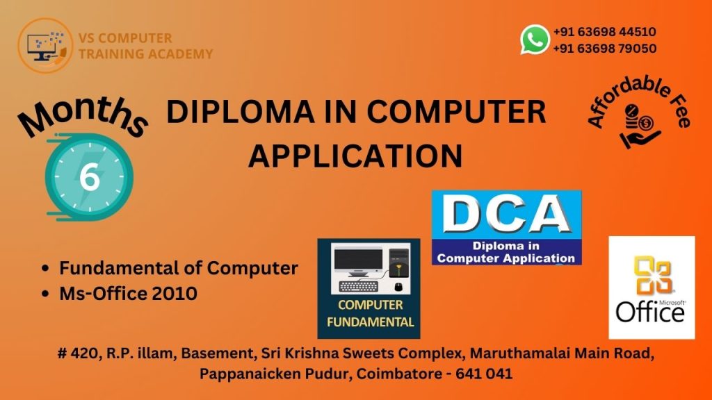 The Diploma in Computer Applications (DCA) course at VS Computer Training Academy is designed for students, job seekers, and professionals who want to gain comprehensive knowledge of computer applications used in modern workplaces. This course provides a strong foundation in essential computer technologies, office tools, programming basics, and internet applications.