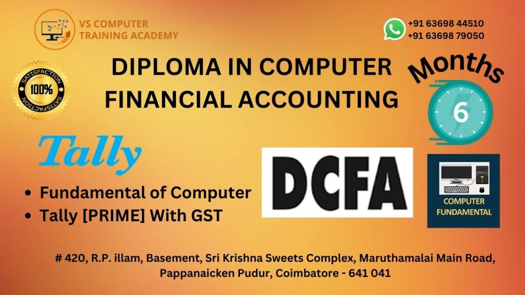 The Diploma in Computer Financial Accounting (DCFA) course at VS Computer Training Academy is designed for students, job seekers, and professionals who want to build strong skills in computerized accounting and financial management. This course provides practical knowledge of accounting principles along with hands-on training using modern accounting software.